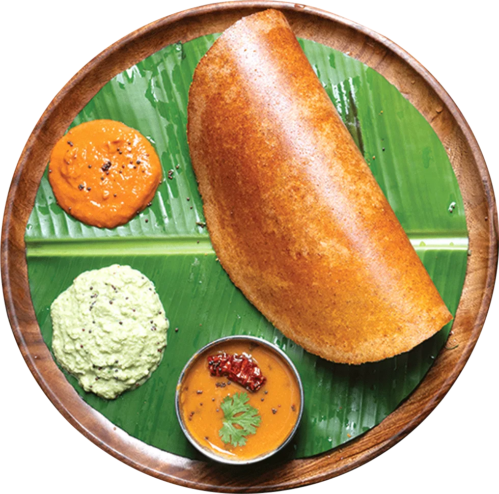 Ghee infused crispy rice crepe filled with spiced potato mixture and generously sprinkled with ghee podi, served with coconut chutney, allam chutney and sambhar.
